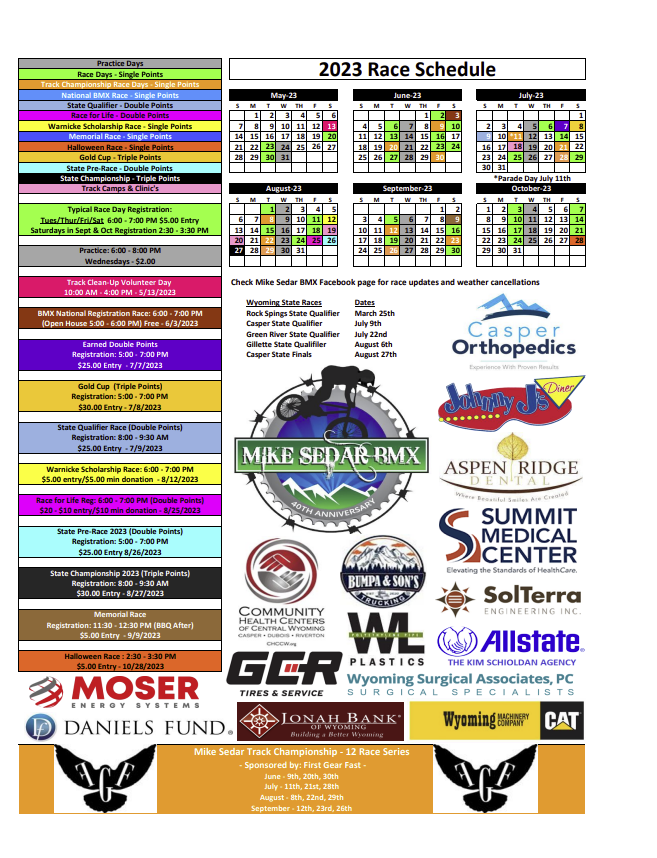 Welcome to Mike Sedar BMX!!! Bicycle racing!! The track is staffed entirely by volunteers who provide children and adults with an exciting family-oriented recreational activity that teaches the value of hard work, perseverance, and a sense of community. Completely updated in 2022 the Casper BMX Facility has new asphalt corners, safety gate, concrete starting hill, new registration building and snack shack, fence, bleachers & so much more. Come enjoy the fun of racing or watching. We have free loaner bikes & helmets. Racing usually starts in May and ends in October. Schedule to be updated each season or go like our Facebook page (Casper BMX Racing - Mike Sedar) for updates.