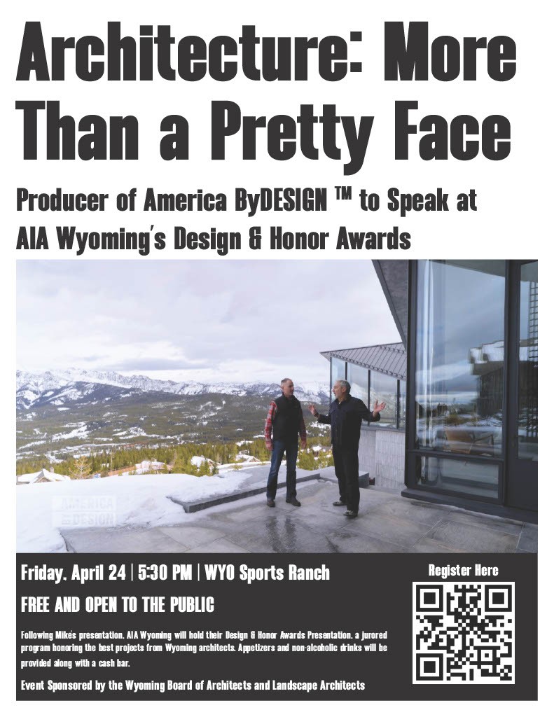Following Mike’s presentation, AIA Wyoming will hold their triennial Design and Honor Awards Presentation, a jurored program honoring our members and their best projects from Wyoming architects – located anywhere around the world. Appetizers and non-alcoholic drinks will be provided along with a cash bar.