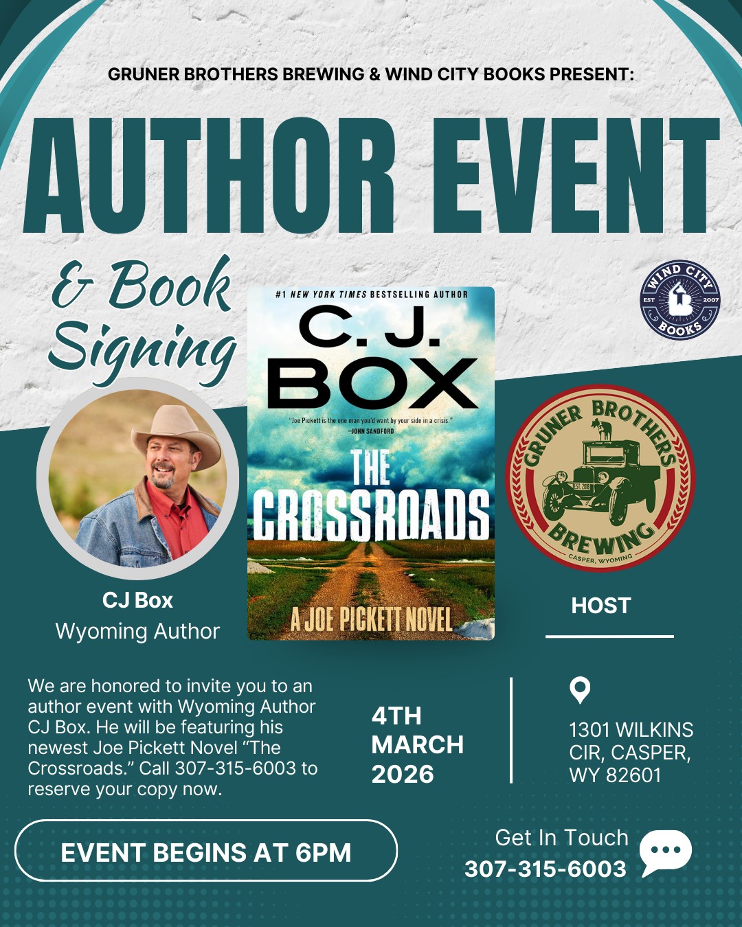 We are honored and thrilled to be hosting CJ Box at Gruners Brothers Brewing Wednesday, March 6th at 6pm. Visit our website for details: https://windcitybooks.com/.../author-event-cj-box-gruner...