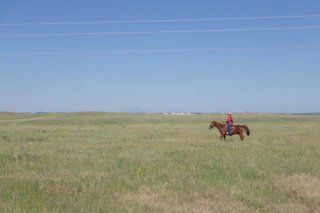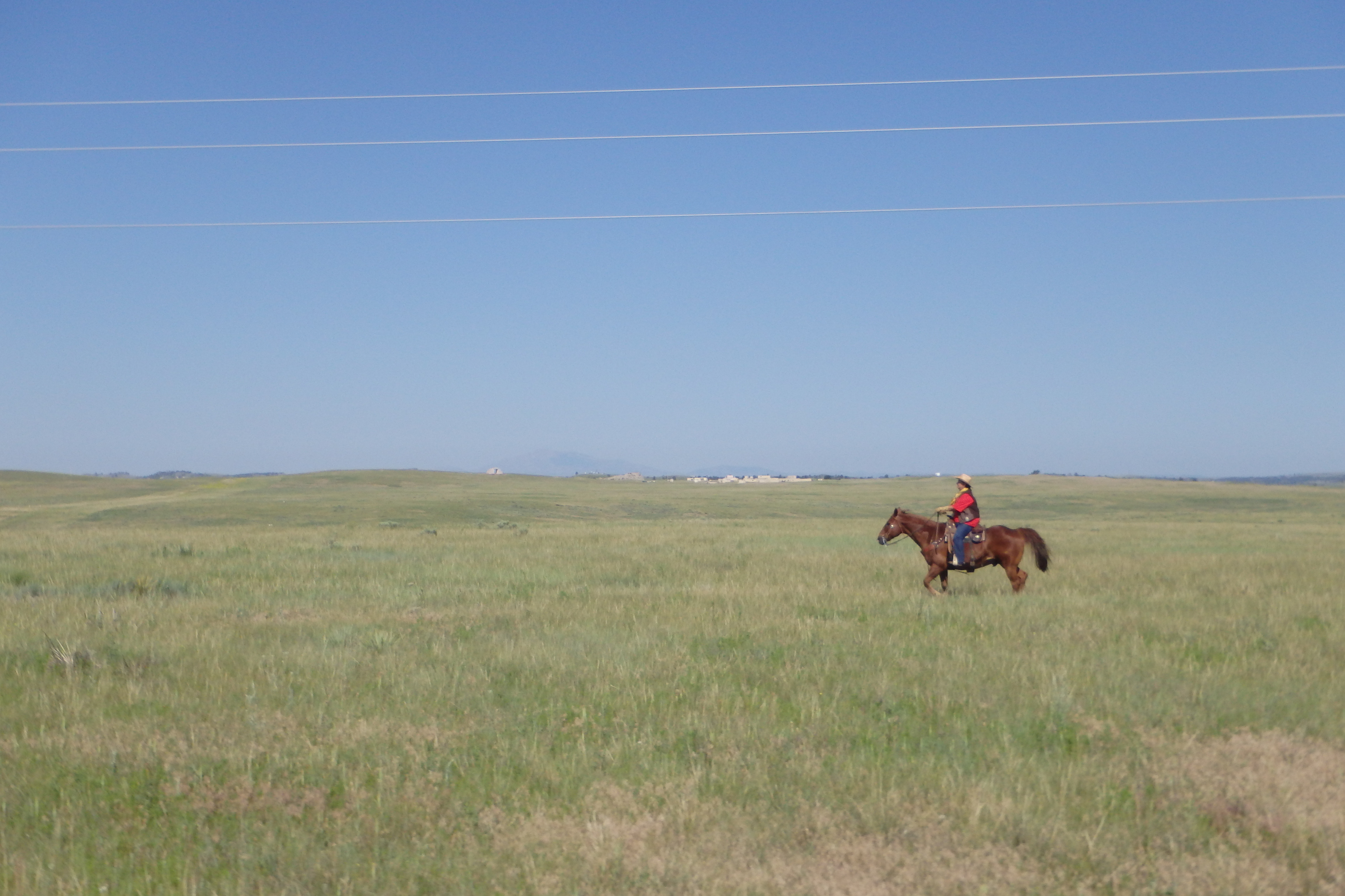 The Pony Rides Again: A lone rider gallops across a landscape of prairie grass and sagebrush and mountain terrain. The sound of approaching hoofbeats is heard from afar. Another rider and horse awaits in the shade of a tree. The incoming rider reins in and greetings are exchanged. Dismounting, the incoming courier lifts a leather mochila from the saddle. It is placed on the new horse and the fresh rider steps into the stirrup, swings into the saddle and begins a ride over the horizon and back into history