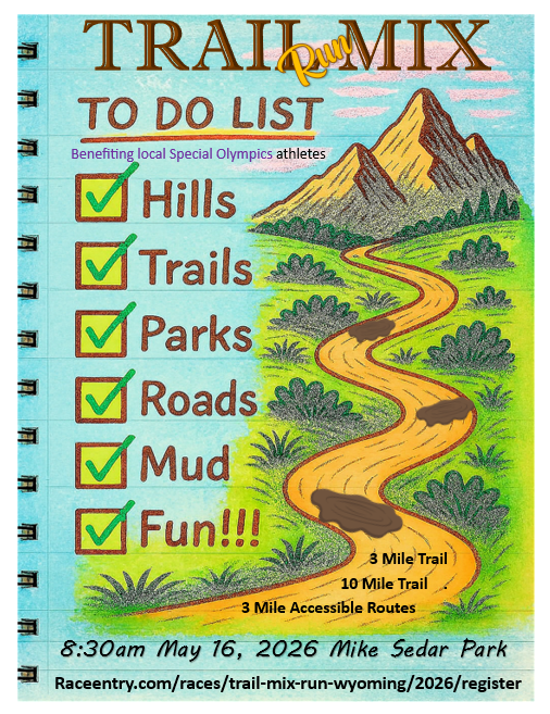 Trail Mix Run is a mixed surface walk or run that benefits Wyoming Special Olympics Area V. All routes start and finish at Mike Sedar Park. The 3 mile accessible route travels around Casper College campus from Mike Sedar. The 3 mile and 10 mile trail routes wind through neighborhoods and parks. There are over 50 volunteers to help everyone stay on course. Registration is open at raceentry.com/races/trail-mix-run-wyoming/2026/register